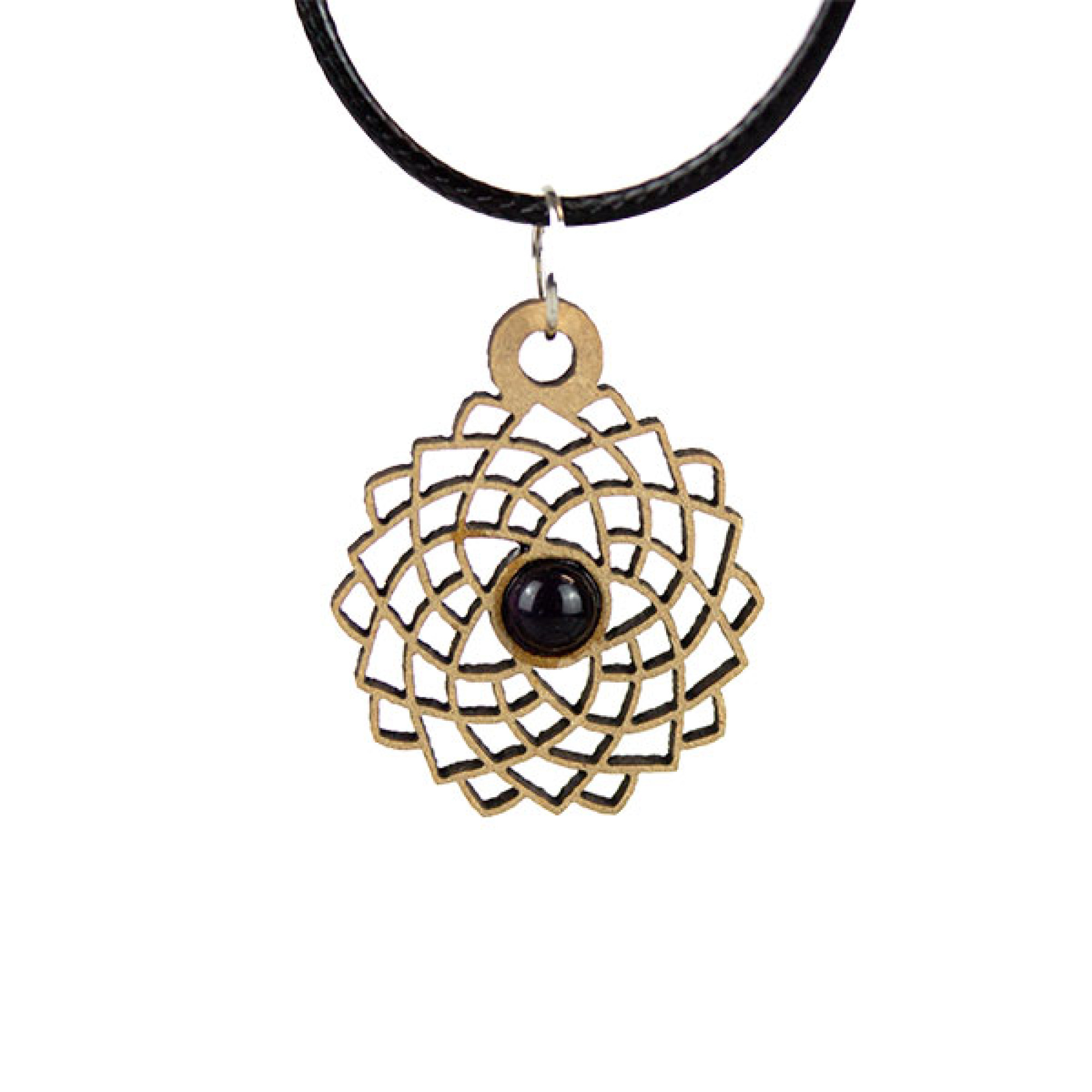 A deep purple agate laid in an intricate wooden pendant and sticker.